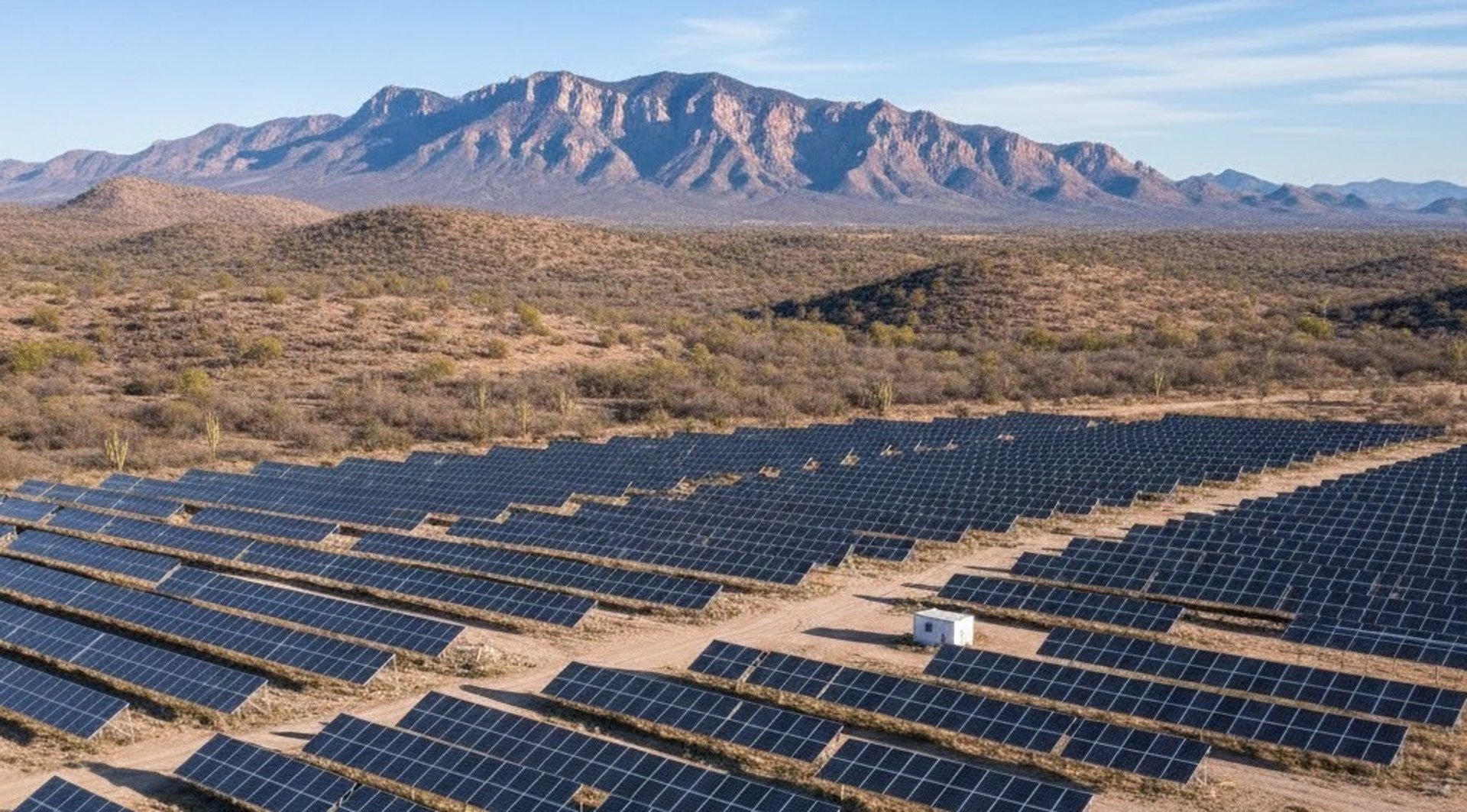 La instalación de paneles solares permite reducir costos y obtener un retorno de inversión rápido.Fotografía de un lugar árido donde hay panales solares en San Luis Potosí en color azul con una montañas al fondo.